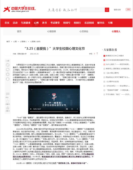 近日,教育部中国大学生在线网站、在线官微转发我校AV大平台 编辑的“3•25(善爱我)大学生校园心理文化节”微视频《善爱青春之我,做新时代的奋斗者》。这也是教育部中国大学生在线网站、在线官微连续三年报道3·25(善爱我)大学生校园心理文化节。新浪网等主流媒体也进行了转发。