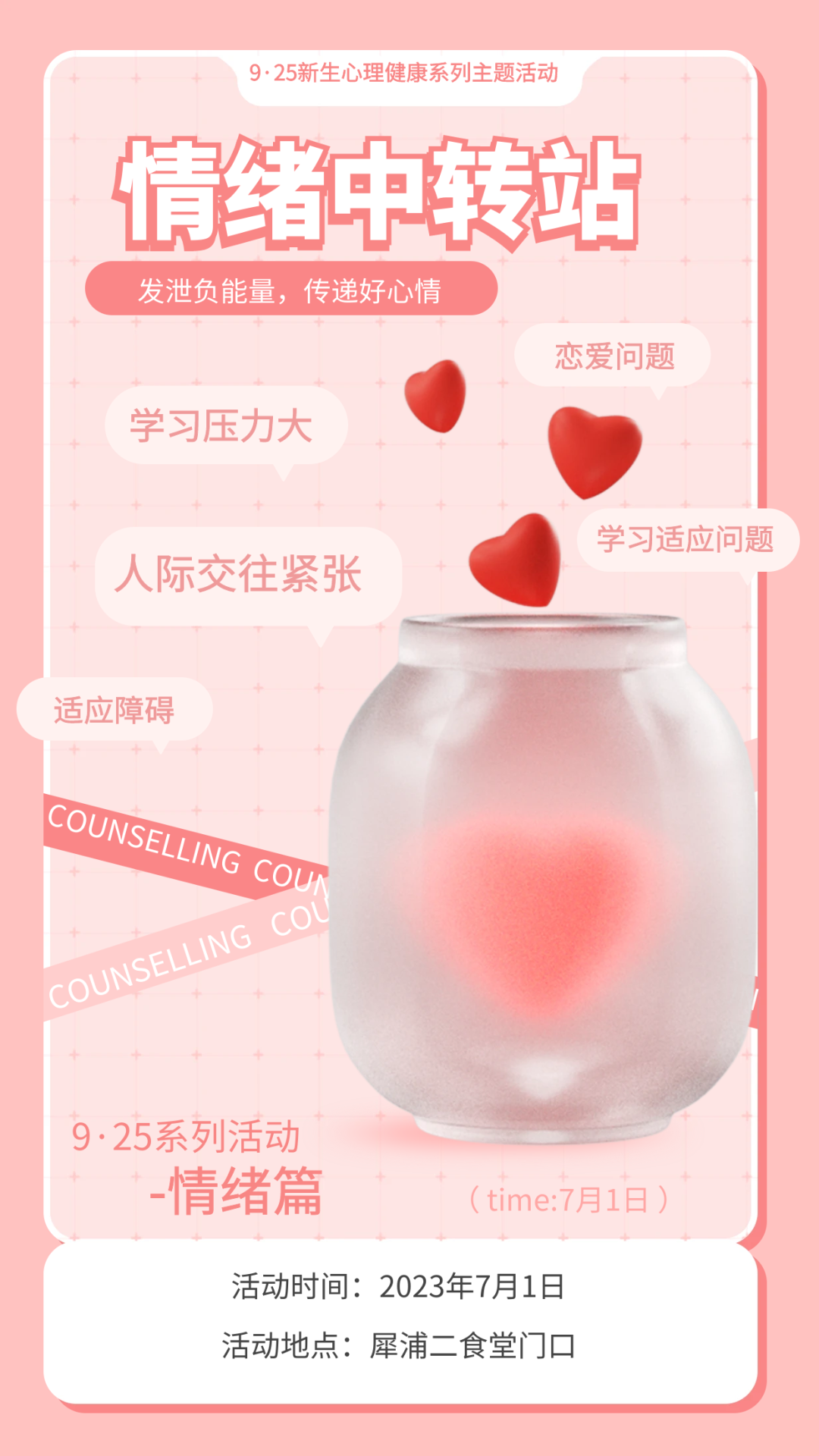 今天是建党102年的日子,西南交大应用心理学专业学生发挥专业的优势、发挥朋辈的作用,结合当前学校心理健康教育工作的需求,在“社会实践与心理健康服务”实习实践中,精心设计“9•25(久爱我)”大学新生心理健康节系列活动,以“心”迎接2023级新生同学们,为今年的新生活动预热打样。以实践行动回报党和人民的培养,立志在心理育人战线上建立新功。