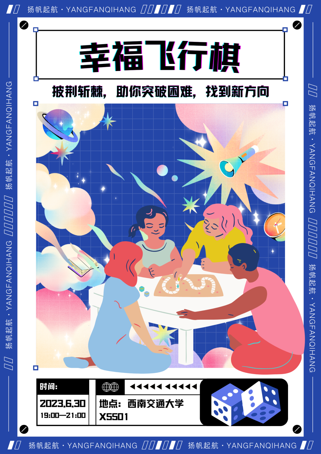人生如棋,棋如人生。幸福飞行棋,棋趣环绕,心力之训,用简单有趣的真人飞行棋方式,引导同学用积极的情绪面对学校生活中的种种困难,披荆斩棘,走出幸福快乐人生。