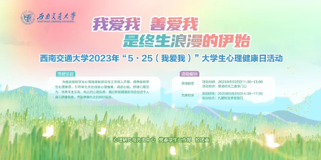 每年的5月25日是全国大学生心理健康日,取谐音“我爱我”,意在提醒大学生关爱自我心理成长,促进自我身心健康。为更好促进大学生“关爱自我,了解自我,接纳自己”,关注自己的心理健康和心灵成长,2023年5月25日,AV大平台