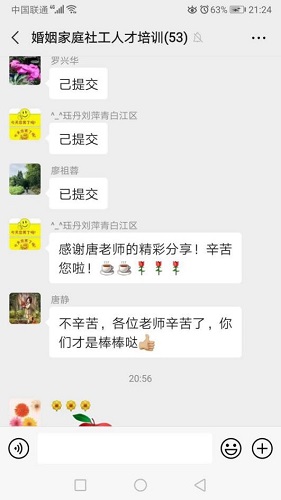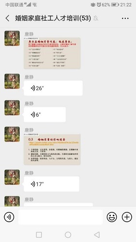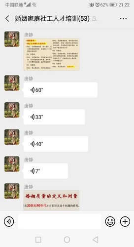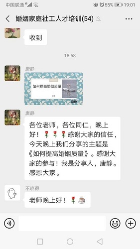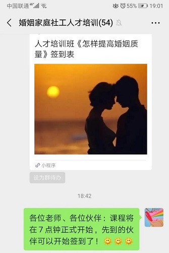 科普基地与成都太阳花社会工作服务中心携手承办的2019年社工示范项目-“暖心故事坊”婚姻家庭项目社工人才培训第二课“怎样提高婚姻质量”在青白江区婚姻家庭社工人才培训群开讲。主讲老师为基地唐静老师。