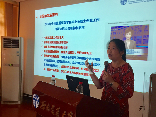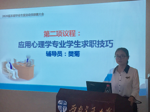 首先黄春蓉副处长对2020届毕业生就业形势进行了总体分析,同时着重强调了心理专业毕业生的就业形势。其次从就业、升学、秋春招的关系、专业特点与学校特色四个方面进行详细的介绍,希望大家从自己的兴趣出发,放宽眼界,转变思路,结合专业所长找到满意工作。