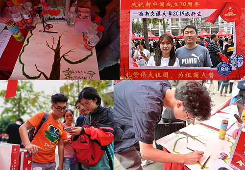 心理咨询与研究中心学生会在一食堂门前举办了以庆祝新中国成立70周年为主题的迎新生活动。一张张热情的笑脸,一句句亲切的问候,一项项贴心的服务,欢迎着从祖国各地来到西南交大的莘莘学子。