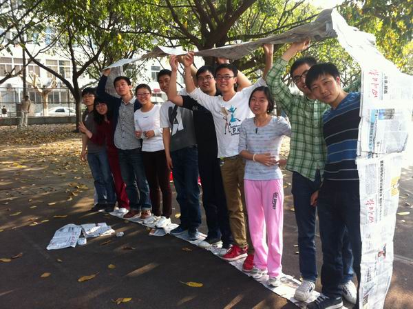在热身活动结束后,训练活动正式开始,比赛用时采用分项活动累加制。活动第一项为“翻叶子”,小组成员扮演水中落叶(布料)上的蚂蚁,在肢体不离“树叶”的前提下,在最短时间内将“树叶”翻过来。这项活动旨在使同学们透过肢体接触,打破人际藩篱、活络团队气氛,从具有挑战性的活动设计中学习问题决策与团队互动。活动第二项为“塞车”,参赛者将所有垫子置放为一排,人员从头到尾两侧依次站到垫子上,之后依次将两方人员互换位置。此项活动内容意在学习人际互动与沟通协调,比赛过程中,各小组成员集体商议方案,克服障碍,尽管用时不一,但所有小组还是顺利地完成了任务。之后,活动进入最后一项——“无敌风火轮”阶段,各小组利用培训师所给的报纸和剪刀做成纸质“轮胎”,比赛时所有队员站在纸轮上前进,先到终点并且纸轮完整者获胜。最后,计时员将各组所有的时间累加汇总,计算出平均时间,根据成绩评出了前三名。赛后,各获胜小组组长总结并同大家分享了经验。他们都认为,要顺利完成任务,团结协作是必须的,作为研究生,在学习上更要发扬团队精神,集思广益,才能取得骄人的成绩。