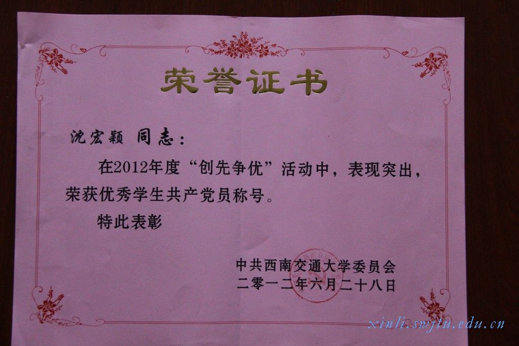 委员会2010-2012年度创先争优表彰大会上荣获“先进学生党支部”荣誉称号,支部08级优秀学生沈宏颖荣获“优秀学生党员”荣誉称号。