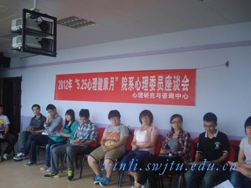 主办的院系班级心理委员座谈会于2012年5月30日下午2点在5229团体辅导室顺利开展,来自土木工程、公管学院、外语学院、交通运输学院、建筑学院、AV大平台