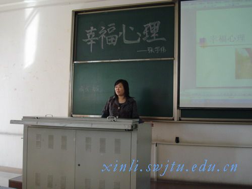 尽管讲座时间是星期六,张老师还是牺牲了自己的休息时间早早地赶到了会场,听讲座的同学们在张老师播放的“幸福是什么”的歌声中踏入会场。讲座正式开始了,张老师先是问了大家对幸福的理解。有人说,幸福就是一种愉悦、充实的感觉,有人则认为,幸福就是被人需要。张老师并没有急于给出评价,只是先讲了一下大家都很关注的幸福与财富的关系。她明确指出财富与幸福有关但绝不是正相关,当财富达到一定程度之后,即“财富鸿沟”时,财富的增加并不能使人增加幸福感。她特别强调,财富只是达到幸福的手段之一,切勿把手段当成目的来追求。她还举了房地产大亨万科董事长王石在将近花甲之年出国游学的事例来说明这一点。之后,她清楚地给出了幸福在心理学中的定义即渴求被满足或部分被满足时的一种精神上是愉悦。接着,她提出了大家都在思考的问题“幸福在哪里”,她说“在这个快速、多变、多诱惑的现实中,人们的常用问候由‘吃了吗’到‘你忙吗’每年都有100万左右的大学生找不到工作······人们似乎找不到幸福在哪里······”,她还通过分析世上最幸福国家丹麦的最幸福原因得出找到幸福的几个因素------生活稳定有保障,可以选择自己喜欢的工作,社交丰富······针对中国国情,张老师着重提到,不幸是在攀比中产生的,“幸福大脑”可以与生俱来,也可以后天培养。她的演讲声情并茂,并不时穿插一些感人或富有哲理的寓言故事,令台下观众都在倾听中陷入沉思。最后,她鼓励大家通过改变自己的心态来积极地寻找幸福。