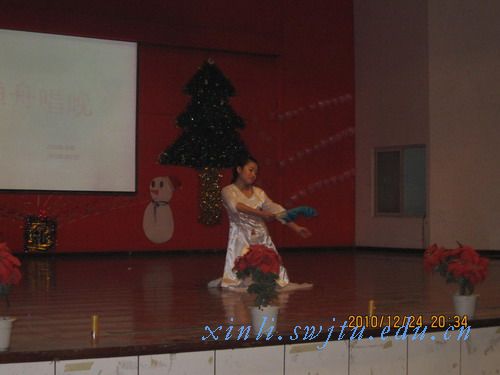 随即,晚会精彩节目正式开始。晚会首先是2010级心理1班七名女同学带来的舞蹈《再次重逢的世界》,尽显摩登女性的妩媚之美。由08级张青同学和江贻戌同学带来的广播脱口秀则以幽默的语言赢得了一阵阵的掌声。轻松幽默之后,则是校跆拳道协会带来的阳刚气息十足的双节棍表演,充分展现了他们极其精湛的技艺,令同学们大饱眼福。为了庆祝这特别的圣诞之夜,2010级一班的陈竹青和张宏立为同学们带了来中英文诗朗诵《圣诞钟声Christmas bell》。他们动情的朗诵和流利的英文令观众们如痴如醉。本场晚会最为精彩的是2010级心理1班表演的小品《非雷勿扰》。同学们出色的表演,精彩的对白,搞笑的台词,逗得观众前仰后翻,全场爆笑如雷,充分展示了同学们多才多艺,充满青春的活力,把晚会推向了高潮。而由08级张青与10级黄之恒合作的古筝伴舞《渔舟唱晚》则把观众带到了一个古色古香的小镇上,尽享古典风韵之美。