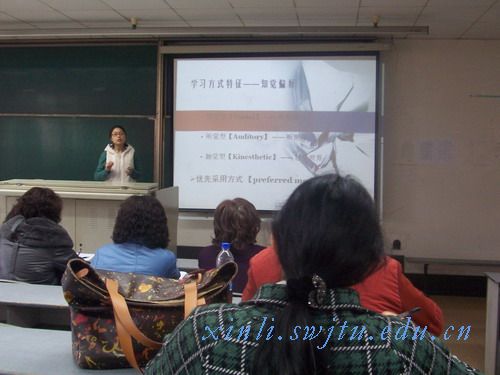 的美女博士董洁老师。董老师不仅人长得美,声音更美。她用幽默的语言诠释了“从知觉偏好解读学习特征”的问题,通过列举历史上以及自己身边的事例向大家清楚地介绍了“视觉型、听觉型、触模型”三种学习方式特征。