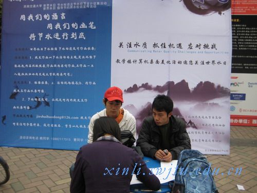 中午时分,印有中国传统写意山水画的巨幅展板早早摆放在一食堂门口,显眼又不失含蓄的意蕴,给节水的严肃主题又增添一些水的柔美。下课时间到了,一食堂门口渐渐聚来很多用餐的同学,志愿者们便趁此机会向路过的同学发放宣传单,并讲解此次活动的有关细节,引领有意向的同学去宣传台报名。有些志愿者刚下课就赶来参加宣传活动,连饭都没顾得上吃,虽然食堂就在眼前,可他们他们还是坚守岗位,卖力地向过路的同学讲解活动的意义。正是由于志愿者的这种奉献精神以及此次活动本身的巨大意义,一个中午的时间就有数十名同学报名参赛。