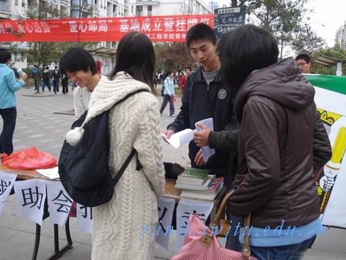 最后,协会成员自豪地向我们展示了他们两天的成果,并表示为“爱心图书室”的“出生”而坚持到底。本次活动不仅让协会成员们获得了成就感,更为重要的是,他们动员全校同学为解决贫困学生读书难的问题贡献出了自己的一份力量。