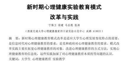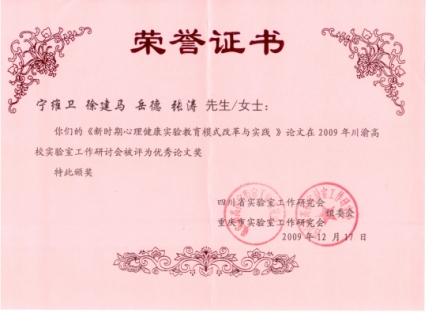 12月16日在四川大学举行的2009年川、渝两地高校实验室工作研究与学术研讨会上,我中心由宁维卫、徐建、马岳德、张涛提交的论文《新时期心理健康教育模式改革与实践》的获得与会专家肯定,获得优秀论文奖。