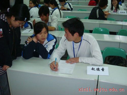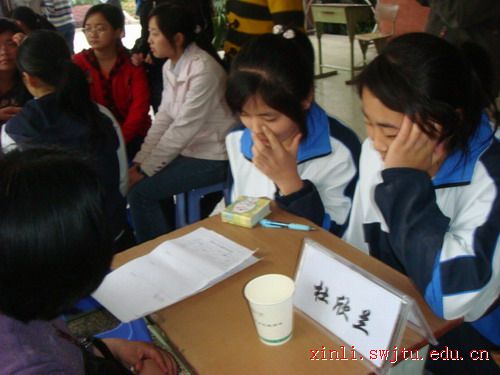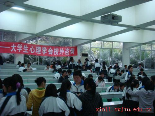 2009年4月9日下午四时许,西南交大心理学会的同学们走进郫县一中,为即将跨入考高考场的考生们进行心理辅导。郫县一中的杨双双老师与我校学生一起参加此次咨询活动。