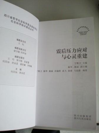 日前由我中心宁维卫教授主编的四川省哲学社会科学普及规划项目《震后压力应对与心灵重建》一书,由四川人民出版社出版。