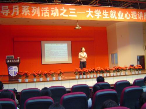 的高飞老师在犀浦校区一食堂三楼为大家带来了一场关于大学生毕业择业的心理讲座。这次讲座是“就业指导月系列活动之——大学生就业心理讲座”,主要是面向大四毕业生在择业与应聘过程中遇到以及会遇到的一些心理现象做一解释说明,另外也吸引了一些大三的学生前来听讲座。