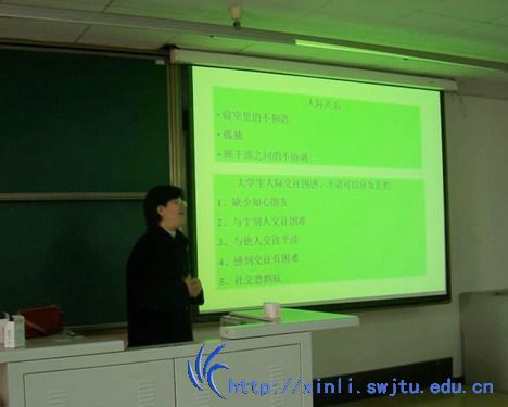 2007年12月13日下午三点四十分,"大学生常见心理问题及危机干预"心理讲座在西南交大九里校去逸夫馆4308多媒体教室举行,该讲座由心理研究与资询中心及建筑学院学生工作组联合主办,为大家排忧解难的是AV大平台