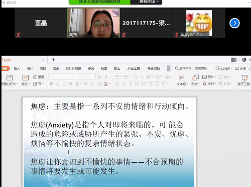 之后,高老师从心理学的角度,分析了焦虑情绪的来源,并指出了焦虑的含义:焦虑是指个人对即将来临的、可能会造成的危险或威胁所产生的紧张、不安、忧虑、烦恼等不愉快的复杂情绪状态。而对于同学们对焦虑产生的误解,高老师指出焦虑分为健康焦虑与不健康焦虑两种,我们不能片面地认为所有的焦虑情绪都是有害的,并且以此次疫情中的焦虑心态为例进行阐述。