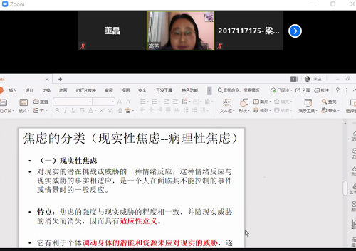 接着,高老师向同学们详细解释了焦虑的分类:现实性焦虑与病理性焦虑,并与同学们进行了线上互动。