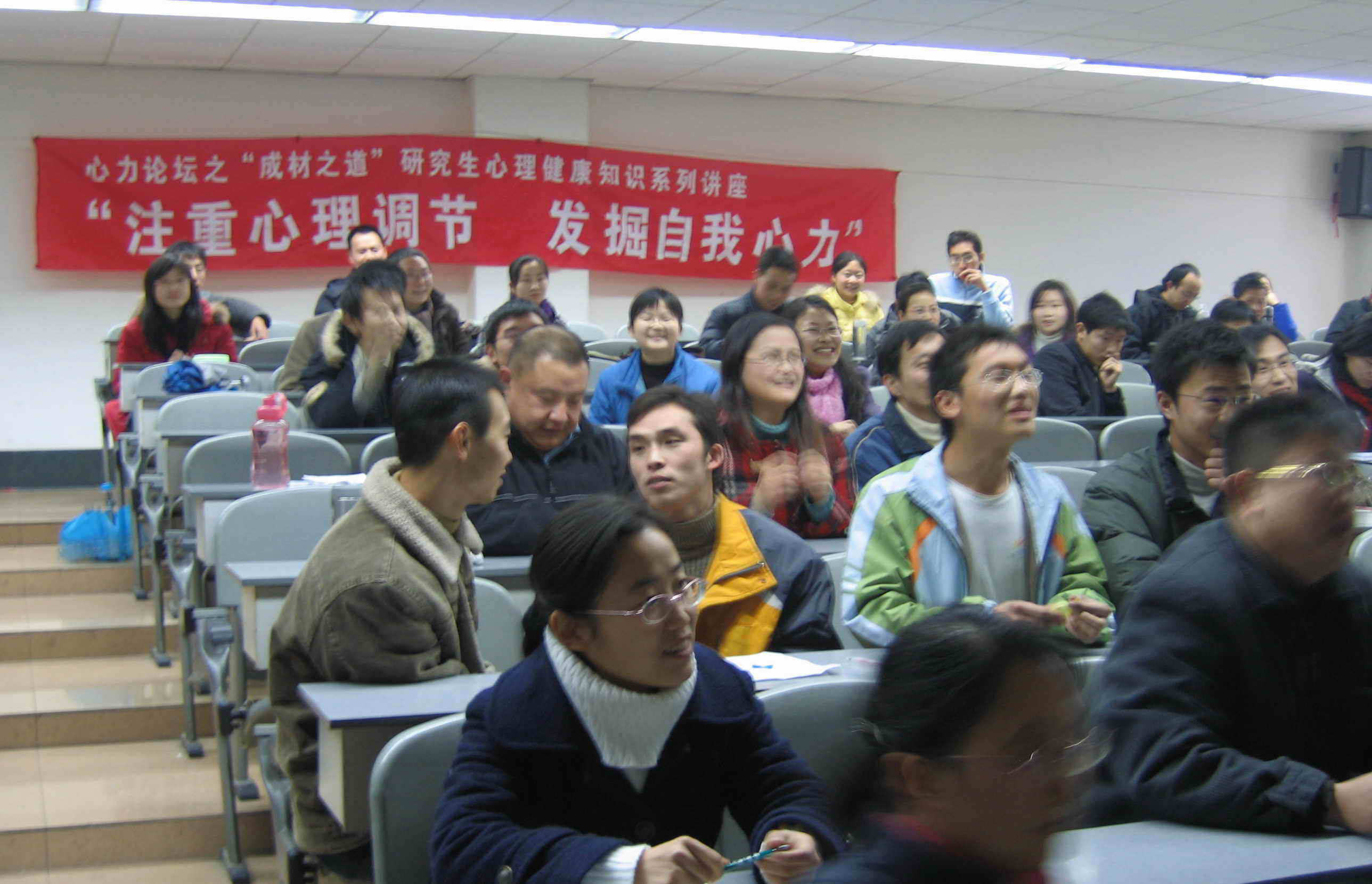 心理学会承办的“心力论坛”“成才之道”――研究生心理健康知识系列讲座《注重心理调节,发掘自我心力》的专题讲座正在进行。 为了举办这次讲座,特地邀请到了四川大学华西临床医学院医学心理学博士、现任西华大学心理科学研究所所长、心理咨询中心副主任吴薇莉教授。吴薇莉教授长期从事大学生心理健康教育和高校心理咨询和治疗工作,卓有成就。讲座一开始,吴薇莉教授就让研究生们做了一个什么是压力的测试,大家七嘴八舌的议论起来,然后是“吹气球”、“老鹰捉小鸡”等活动,一方面让大家深切体会压力的感受,一方面教室里的气氛活跃了起来。之后,吴薇莉教授与大家一起讨论了(1)哪些问题会对我们产生压力;(2)在压力下我们会有什么样的情绪、身体和行为上的应激反应;(3)压力总是糟糕的事情吗?(4)我们如何应对面临的压力等几个方面的问题。吴薇莉教授的讲解生动、活泼,内容丰富,贴近实际生活,大家感到深受启发。讲座结束后,不少的同学还主动找吴薇莉教授要联系方式,希望以后可以继续交流,还有的同学现场请吴薇莉教授进行了个别咨询。