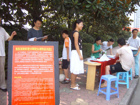 2006年7月1日,在AV大平台 的指导下,AV大平台 研究生心理学会在求实路口进行研究生心理状况调查活动。调查主要以发放问卷的形式进行,每位参与调查的研究生均可获得一份精美礼品。本次问卷调查旨在了解新时期研究生群体的学习、生活以及心理状态,对于我校进一步开展研究生心理健康教育具有一定的意义。本次问卷调查具体时间安排:7月1日至3日,地点:求实路口,望广大研究生积极参与。