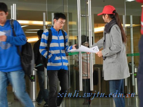 2011年11月14日中午11点半,由校图书馆和机械工程学院团委主办,机械工程学院青年志愿者协会承办的“你好,图书馆”活动在一、二、四食堂门口和图书馆举行,这次活动旨在让更多的交大学子对网上图书馆有进一步的了解,让书香之气传到交大的各个角落。宣传部部长胡东泽、肖洒、陶仕东以及办公室部长张琪带队参加了这次活动。