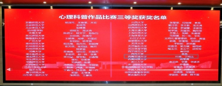大赛共设立三个赛道:心理咨询/心理治疗面谈技能比赛、应用心理案例比赛、心理科普作品比赛。中心应用心理学专业学位研究生首次在所有赛道均获奖,斩获案例开发赛道二等奖(参赛成员:杨谨、王淑君、张汇林,指导教师:董洁、杨兴鹏、张学伟)、心理咨询面谈赛道三等奖(参赛成员:张婧萱,指导教师:董洁)、心理科普视频三等奖(参赛成员:叶娅、丁纯洁,指导教师:冯果)。
