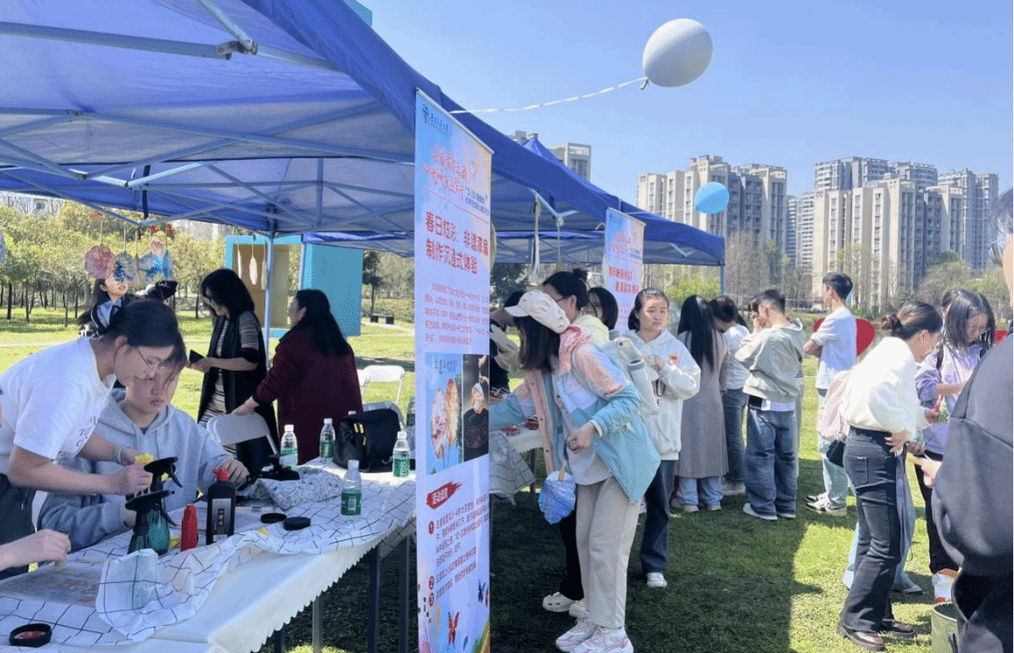 在户外互动体验区,茶饮与养生养心、蜡染制作与体验、拓印体验活动、漆扇制作、糖人、胶泥手工与书签、面具绘制体验、“春日簪花记”景泰蓝非遗手工发饰DIY、扭扭花制作、九连环等10个项目整齐排列。活动现场气氛热烈,同学们积极参与,每个摊位前都人头攒动,欢声笑语不断,特别是漆扇制作和转糖人摊位前更是排起了长队。同学们在动手实践中体验着传统工艺的精妙与乐趣。