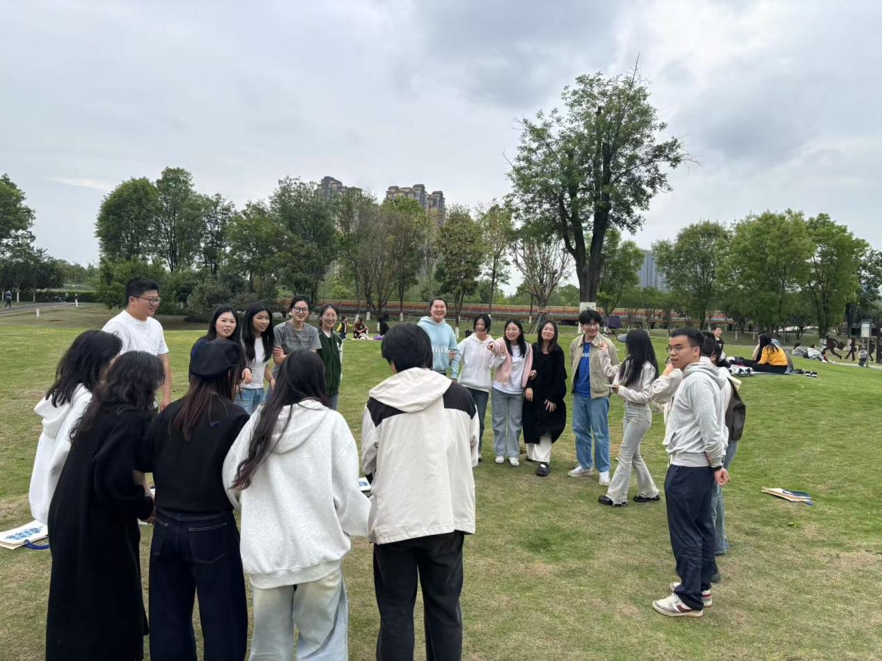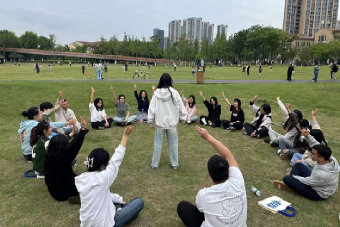 活动以草坪上的"声音冥想"拉开序幕。参与者闭目聆听风铃、颂钵与吉他即兴演奏的自然协奏曲,通过呼吸调节与声音引导逐步放松身心。随后的破冰环节中,"桃花朵朵开"和"大风吹"游戏迅速打破专业壁垒,心理学学生运用非言语沟通技巧引导马克思主义学院同学融入集体,笑声与奔跑的身影让春日的草坪焕发生机。