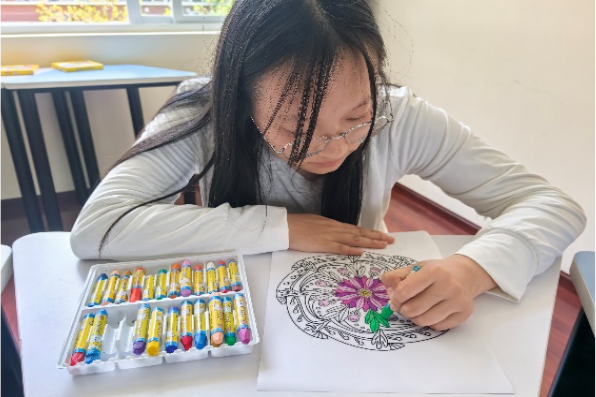 核心环节曼陀罗创作将活动推向高潮。汪老师引导学生选择几何模板并跟随直觉填色:“让颜色替你说话,表达难以言说的情绪,发现被忽略的内心需求。” 学生们沉浸在创作中,有人用暗色漩涡宣泄压力,有人以渐变色调隐喻成长,还有人在对称图案中寻求秩序。这种 “非语言出口”不仅激活了潜意识,更通过视觉符号的整合实现了心理能量的转化。