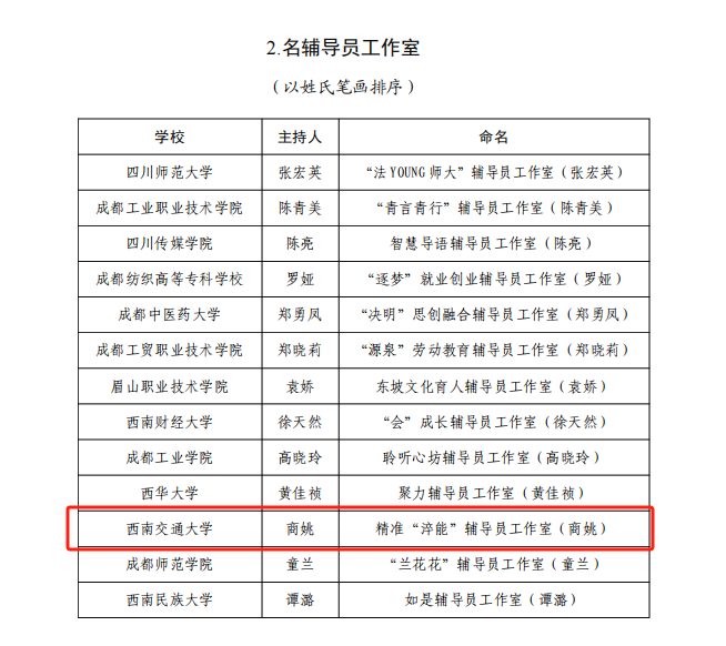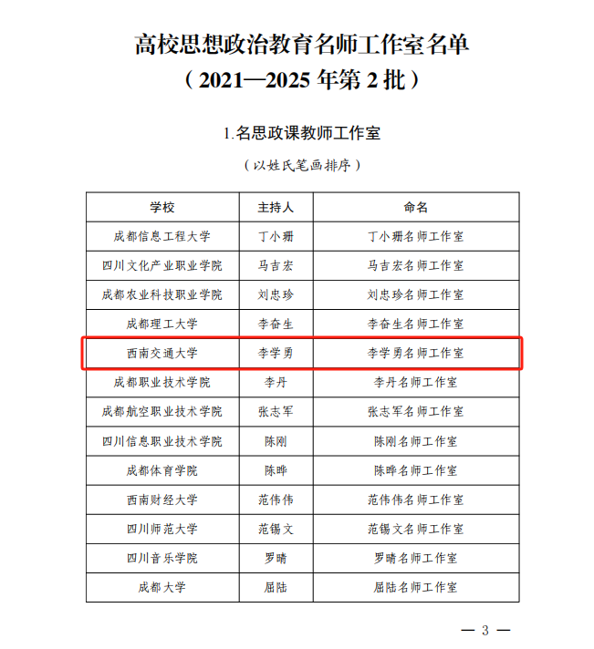 近日,中共四川省委教育工作委员会、四川省教育厅公布(2021—2025年第2批)高校思想政治教育名师工作室名单。学校马克思主义学院副院长李学勇教授主持的“李学勇名师工作室”入选名思政课教师工作室,土木工程学院辅导员商姚主持的“精准‘淬能’辅导员工作室”入选名辅导员工作室,AV大平台