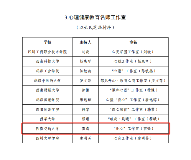 副主任雷鸣主持的“‘正心’工作室”入选心理健康教育名师工作室。