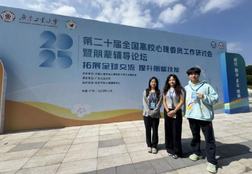 2025年11月5日-8日第二十届全国高校心理委员工作研讨会暨朋辈辅导论坛在广州工业大学举行,本次研讨会由中国心理学会心理危机干预工作委员会主办,主题是“拓展全球交流,提升朋辈技能”。我校利兹学院胥嘉文、智慧城市与交通学院张思雨、公共管理学院马尔丹·别克加沙尔三位心理委员,凭借扎实的专业能力与暖心的朋辈行动,在此次研讨会中,成功入选全国百名心理委员风采展。