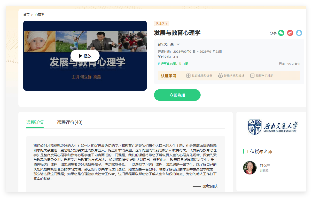《发展与教育心理学》:[https://www.icourse163.org/course/SWJTU-1206493811] (https://www.icourse163.org/course/SWJTU-1206493811)