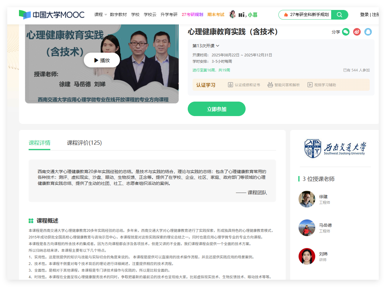 《心理健康教育实践(含技术)》:[https://www.icourse163.org/course/0711SWJTU071-1206457816] (https://www.icourse163.org/course/0711SWJTU071-1206457816)