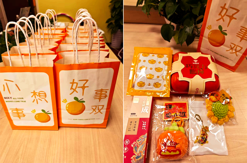 此次慰问精心准备的 “心想事橙” 主题礼包,每一份都承载着满满的心意与美好寓意: 鲜亮的包装 “ 心想事橙,好事橙双 ”,寄托着 “心想事成、金榜题名” 的真挚祝福;实用的 考试用笔 ,寓意 “妙笔生花、答题流畅”;精心搭配的 小挂件、暖宝宝与巧克力脆柿 ,愿同学们在紧张 的 备考中也能收获甜蜜与 温暖 ,好运常伴,愿大家以从容心态奔赴考场,不负韶华。