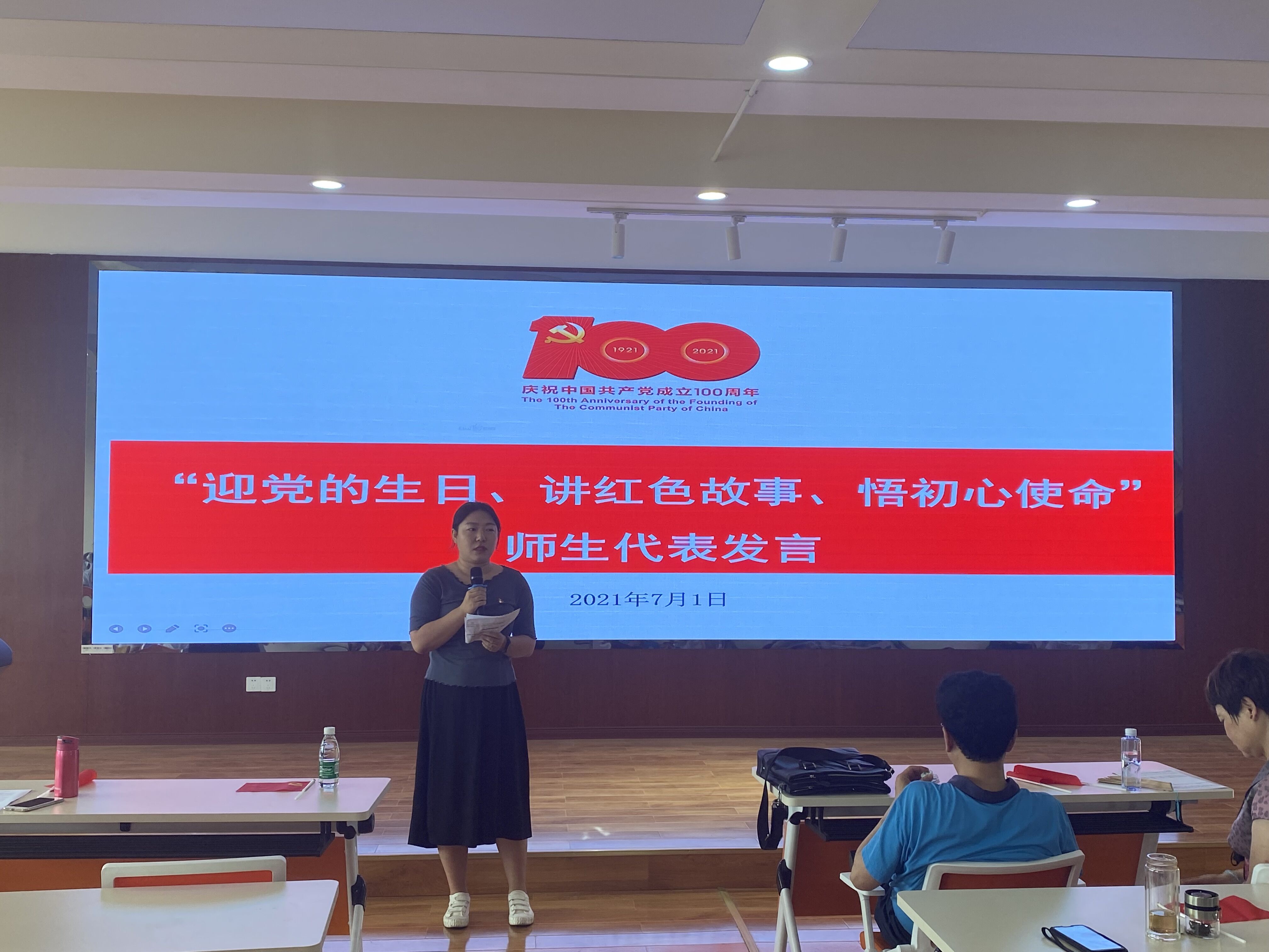 学生党员代表张海乐讲述了自己的成长过程中受到的国家政策的帮扶,看着家乡日新月异的变化,深刻体会到祖国的强大,并向中国共产党表达了自己深深的感谢与祝愿。