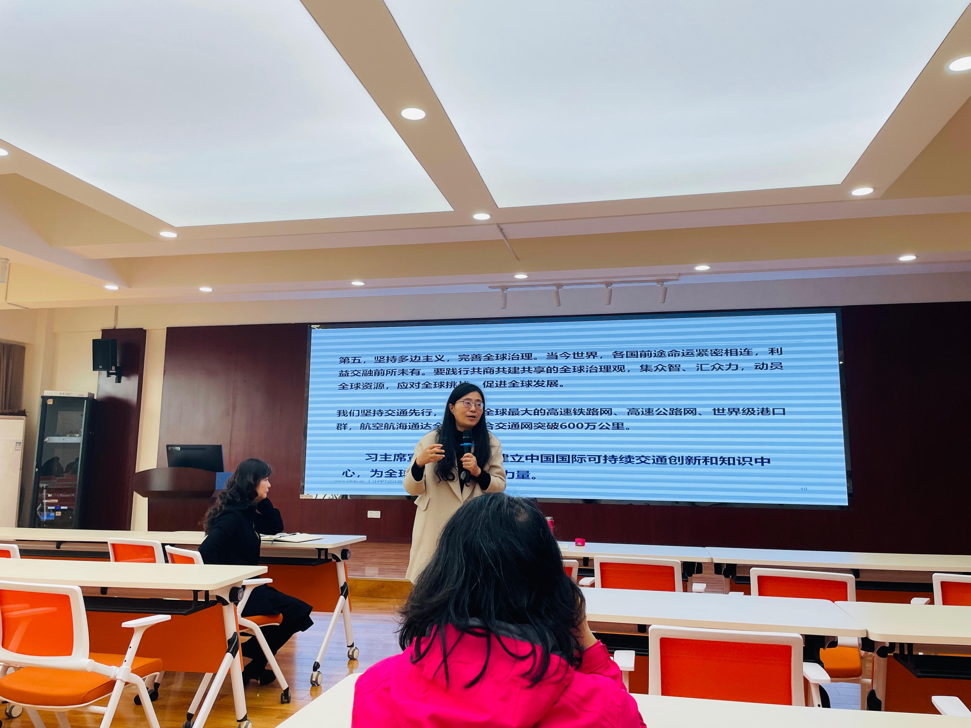 最后,陈华主任带领全体教职工学习了习近平主席在第二届联合国全球可持续交通大会开幕式上的主旨讲话精神,强调了中心教师要加强学习,结合心理特色,思考并做好相关工作,为交通强国建设出一份力。刘咏梅书记最后补充道,中心教师要深入思考习近平总书记的讲话精神,认真梳理工作内容,结合自身工作,切实明确落实举措,为可持续交通发展贡献力量!