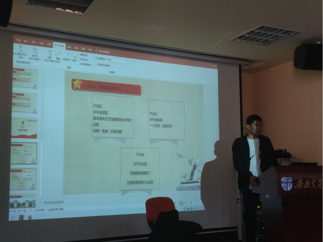 本次活动由先后三位退伍在校大学生士兵宣讲,第一位是由刘誉为我们讲述应征入伍的政策,以及退伍以后的优惠政策,妙趣横生地讲述了入伍的优点。而孙鹏为我们详细分享了部队里面的日常生活,并合理说明了入伍的缺点以及流程。而艾山玉森则是分享了一些他在军营里面的一些具体有趣的小事件,给了我们一个军旅生活的缩影。本次活动中,同学们积极活跃,宣讲人风趣幽默,活动现场十分融洽。
