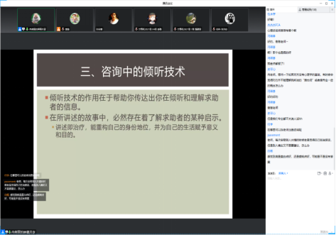 活动伊始,冉老师以几个生动的故事和案例引出对沟通的理解,明晰发起人和回应人两个概念。冉老师指出,沟通过程的发起人(求助者)是有回应需要的,回应的本身就有帮助的效用,有效的沟通就是正确识别求助者潜在的含义。之后,冉老师强调了学会倾听的重要性,求助具有行为请求、信息请求、理解或参与的请求、不恰当的互动请求四种需求,而每种需求类型对应着一种恰当的回应方式。能够分辨求助者的信息类型是恰当回应的基本前提,冉老师通过四个例子进行测试,让同学们更深刻地理解和分辨求助者的需求类型。然后,冉老师指出,共情、尊重、热情温暖是有效回应的基本因素(促进性因素)。当帮助者能够展现三个特征时,求助者更能够促进其探索并展示自己的真实想法,为与求助者建立关系、提供帮助奠定坚实基础。最后,同学们提出了一些疑问,冉老师均耐心给予了解答。