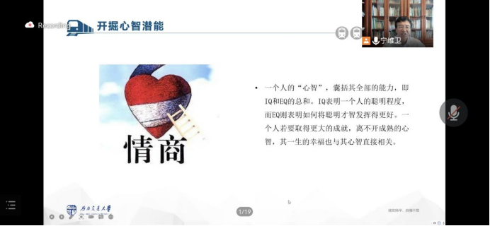 讲座最后,宁教授提出了“开掘心智潜能”、“拥有‘三心’‘四创’”和“做智慧的我”的建议。他指出,“心智”这个观点和佛教“般若”观点类似,是洞悉事物本源的智慧。而自信心、进取心、责任心和爱心是疫情条件下大学生应该具有的“四心”,要敢于面对问题,积极进取,拥有“大爱之心”。宁教授还特别强调“创意、创新、创优”,激励同学们要勇敢地超越困难,创造“美”的世界,做智慧的自己。