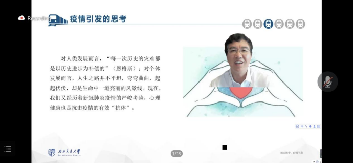 宁维卫教授从“疫情终究会结束,生活终究会进入常态”的基本观点出发,强调在疫情中,心理健康和身体健康一样,都非常重要。他提醒同学们在疫情下要用立体化视角看待生活中的问题,要保持住自己的“精气神”和“正能量”,在感动自己的同时也要感染他人。宁教授结合自己的成长经历,指出在这样一个影响全人类的大事件下,我们都是历史的见证人。在这场“危机”中我们不仅要看到“危难”,更要看到“机会”,希望大家借此机会,做出积极的人生思考。