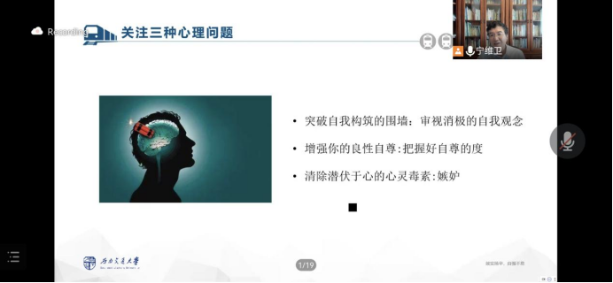 宁维卫教授从思想和行为两方面,结合自己的体会和经历,建设性地为大家强调,在疫情中,我们要保持积极的心态,要“相信明天会更好”,从容地面对生活中的各种困难,激发自己的潜能,要正视心理问题。他结合自身经历批判了大众对于“心理问题”的偏见和误解,强调出现心理困惑、心理问题是正常的,要勇敢地直面内心的疑惑和遇到的问题。宁教授强调,在疫情条件下尤其要重视三种心理问题:自我观点、自负和嫉妒问题,并提出当前产生心理问题的根源主要是在“自我”。他结合谷爱凌的例子,强调一个人要关注自己的价值,要本着“知之为知之,不知为不知”的心态,把握好自尊的“度”。宁教授强调要树立正确的“得失观”,他还鼓励大家要去探寻自己的追求和价值,找寻适合自己成长的土壤。