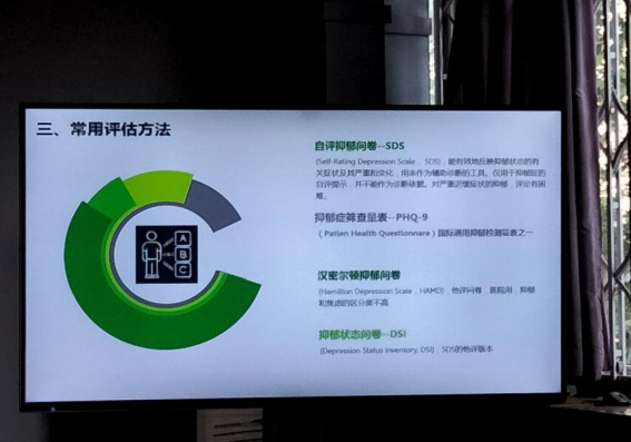 何立群老师第一部分讲解抑郁的典型特征及评估;何立群老师否定了网络上一些哗众取宠的“问卷” ,提醒同学们进行抑郁症自评时要选择国际通用的、具有权威性和可信性的量表。她发给同学们两份自评抑郁量表,让同学们亲身自评。