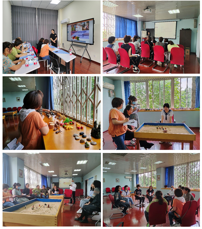 冉俐雯老师主讲,该培训内容由理论和实践两部分构成。冉老师首先为黄琅中学教师介绍关于沙盘技术的理论知识并组织各位老师对沙盘活动所需道具进行了解。其次,在冉老师的指导下,黄琅中学教师参与沙盘模拟咨询的实务活动,并对沙盘模拟咨询活动的感受进行反馈,最后由冉老师进行总结并提出专业建议。