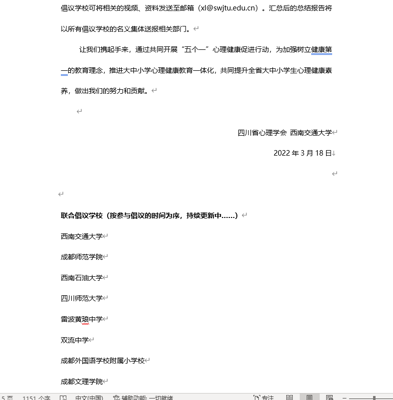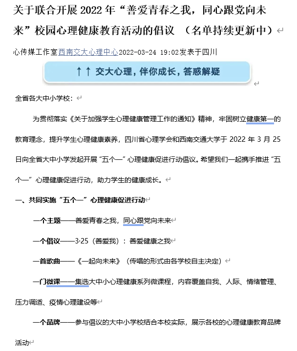 于2022年3月18日向全省大中小学发起开展“五个一”心理健康促进行动倡议。本次活动有全省大中小学近50所学校参加。