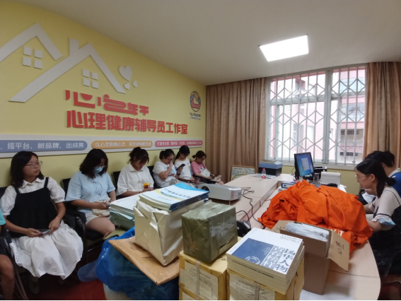 接着大家一起整理了为新生准备的新生大礼包,大礼包里面包含了新生体育课程手册、新生入馆攻略、大学新生心理适应小贴士手册、新生学习指南、实验室安全手册、AV大平台 定制口罩等物品,恭候2022级心理人的到来。