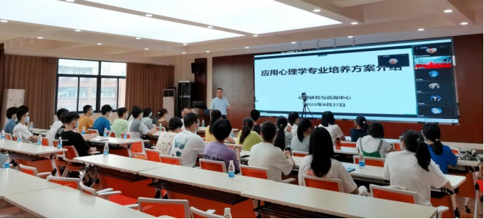 于2022年8月27日(周六)上午10:30在x5501召开2022级应用心理学本科专业培养方案介绍会议。会议分为线下教室与线上腾讯会议(暂缓返校学生)两个空间同时进行,会议主讲人为雷鸣副教授,2022级新生本科全体参与。