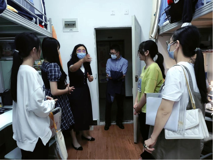 党委书记刘咏梅、副书记柯小君和新生班辅导员樊菊老师走访了新生宿舍。在疫情大环境下,大部分同学就地欢度国庆,领导们与同学们交流谈心、叮嘱放假期间的注意事项、了解同学们的生活和学习状况,并给予了一定的关怀和帮助。