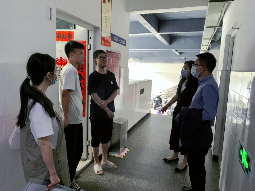 在走访宿舍期间,领导们倡导大家就地过节,并安排好生活和学习;叮嘱同学们出行要遵守疫情防控要求,注意做好自我防护,同时也要注意交通安全、人身财产安全、用电安全等。领导们十分体贴关心同学,走访第一个寝室时,一位体育特长生同学刚训练完正在休息,领导们便放轻了谈话声与动作,担心打扰到这位同学休息。在与其他同学的交谈过程中,领导们关心同学们的生活状况、室友之间的人际关系是否融洽等,并大力支持同学们组织团建活动,过一个充实愉快且安全的国庆假期。