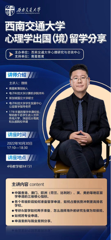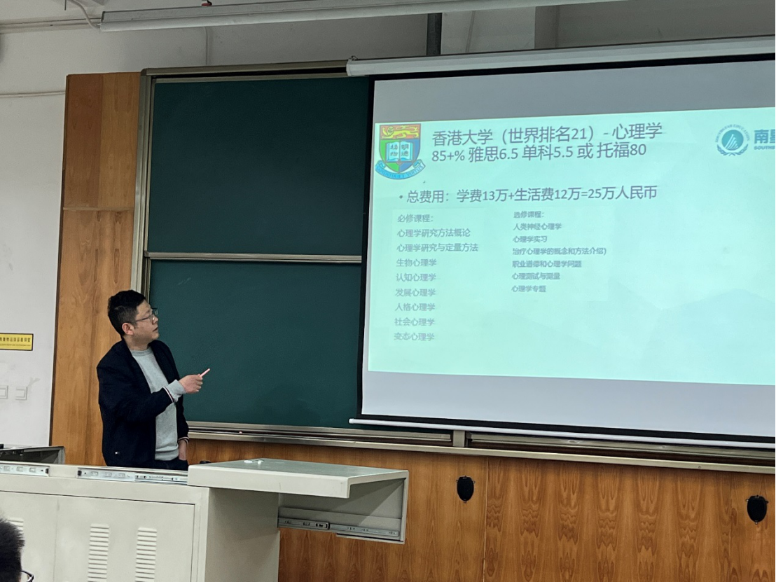 魏楠老师自本科从电子科技大学计算机学院毕业后前往新加坡国立大学攻读硕士,之后致力于帮助更多学子走出国门,拓展视野。培训中魏楠老师主要从留学准备工作和各地区心理学专业及学校进行介绍。